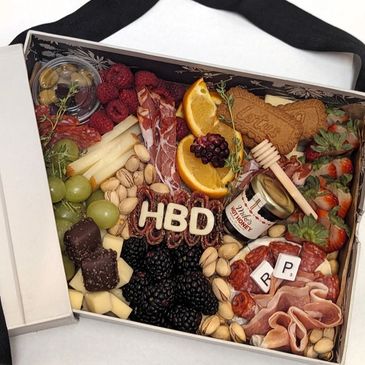 Beautifully styled charcuterie boards, boxes, grazing tables, and individual servings made with curated meats, cheeses, fruits, and gourmet pairings.